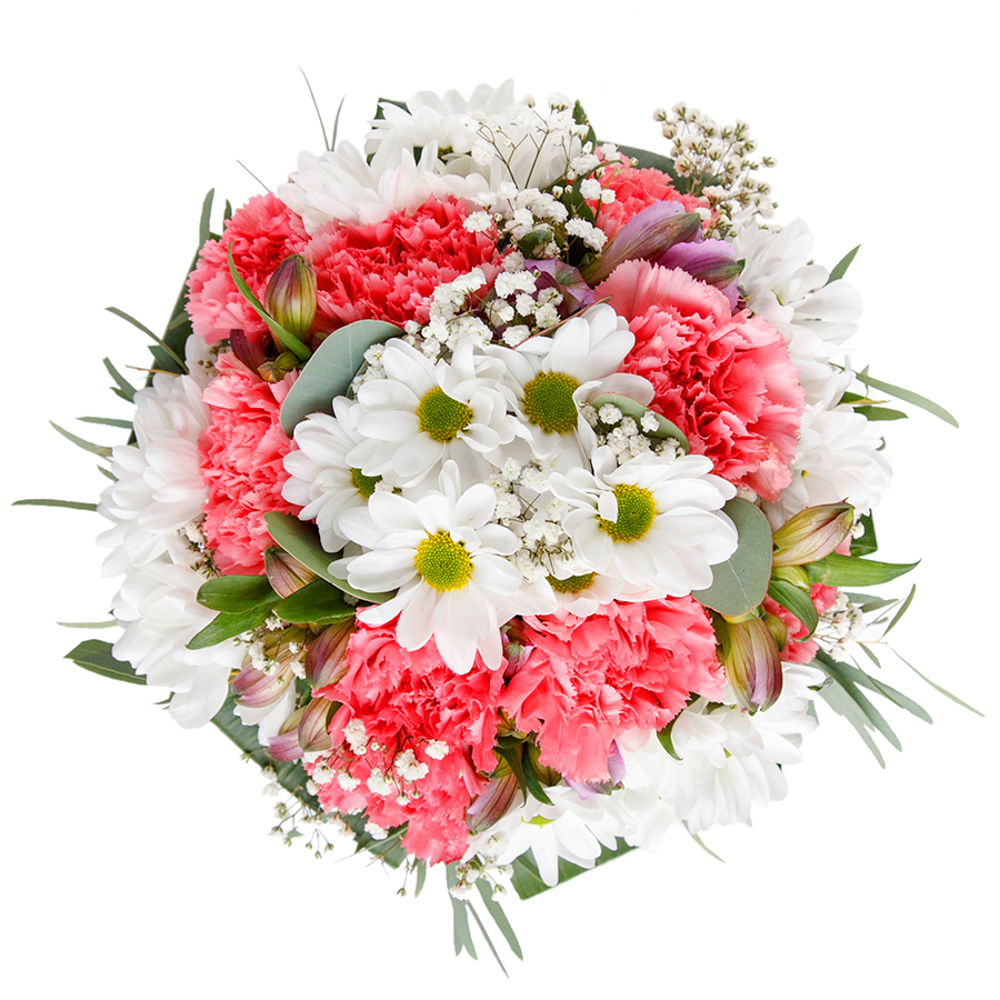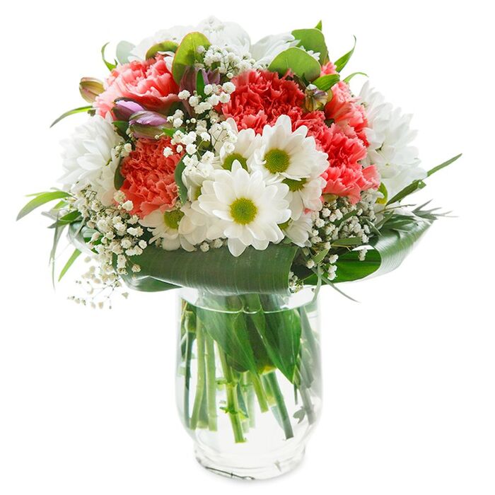Our charming white and pink flower ensemble is designed to brighten any day. This exquisite bouquet features snow-white chrysanthemums, delicate gypsophila, and vibrant light pink carnations, all meticulously arranged with aspidistra leaves. The unique combination of colors and textures makes it a standout gift for your loved ones.